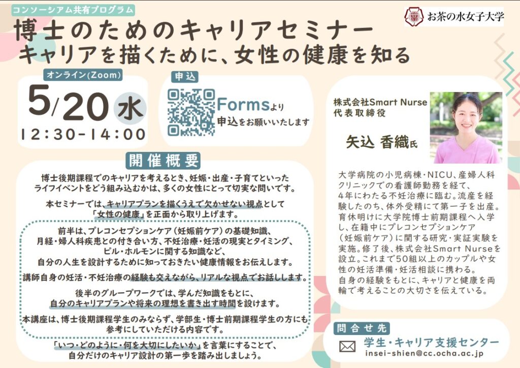 開催前 応募受付中【お茶の水女子大学】博士のためのキャリアセミナー~キャリアを描くために、女性の健康を知る