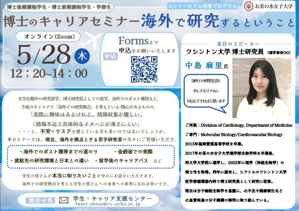 開催前 応募受付中【お茶の水女子大学】博士のためのキャリアセミナー~海外で研究するということ