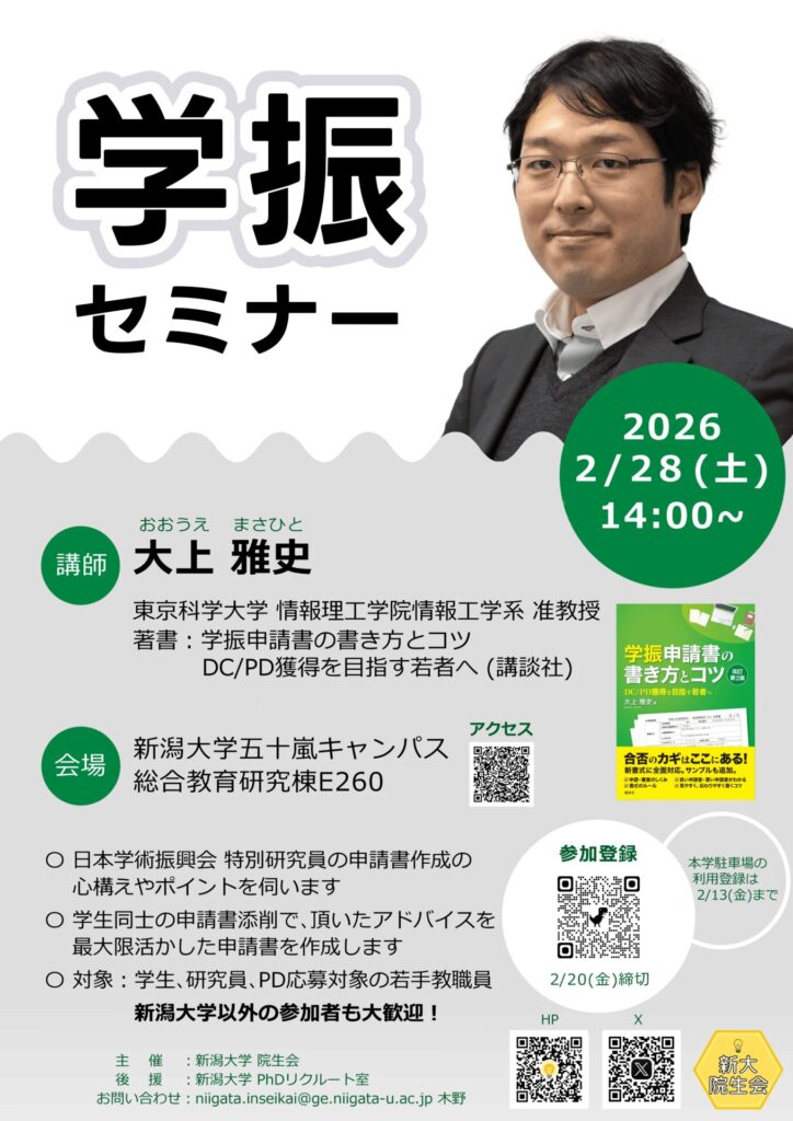 ”学振本”で有名な大上雅史先生による学振セミナーを、2026年2月に新潟大学五十嵐キャンパス 総合教育研究棟E260で行います。 学振(日本学術振興会特別研究員)申請書類の書き方やコツを学び、大上先生に直接ご質問できる貴重なセミナーです! 学振以外の研究費申請書に必要なエッセンスも学べます! 参加をご希望される場合は事前の参加登録をお願いします。 |