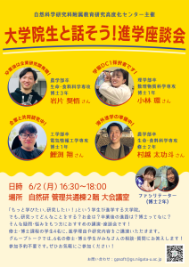 新潟大学自然科学研究科 教育研究高度化センターから、大学生・大学院生向けのイベントの案内です。